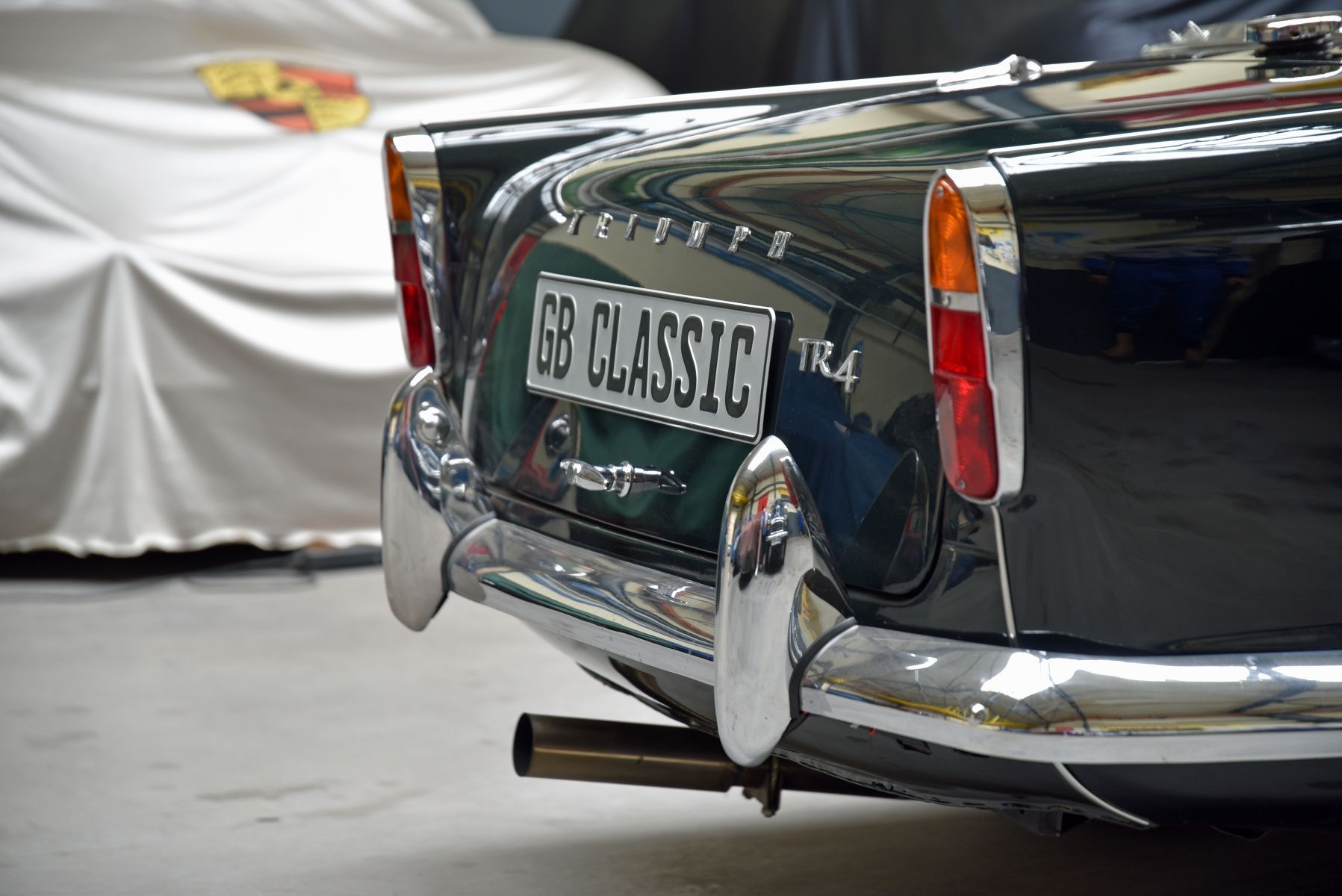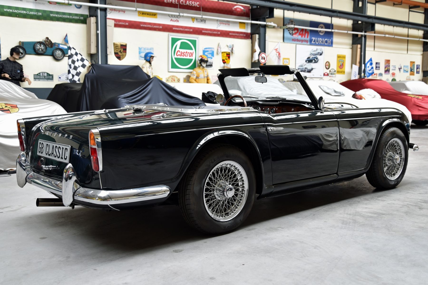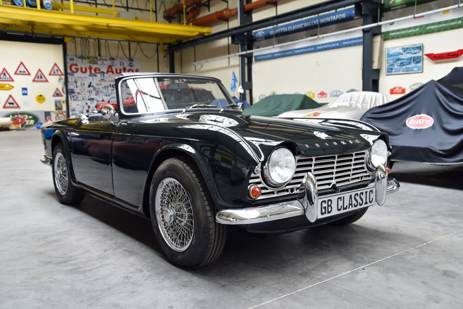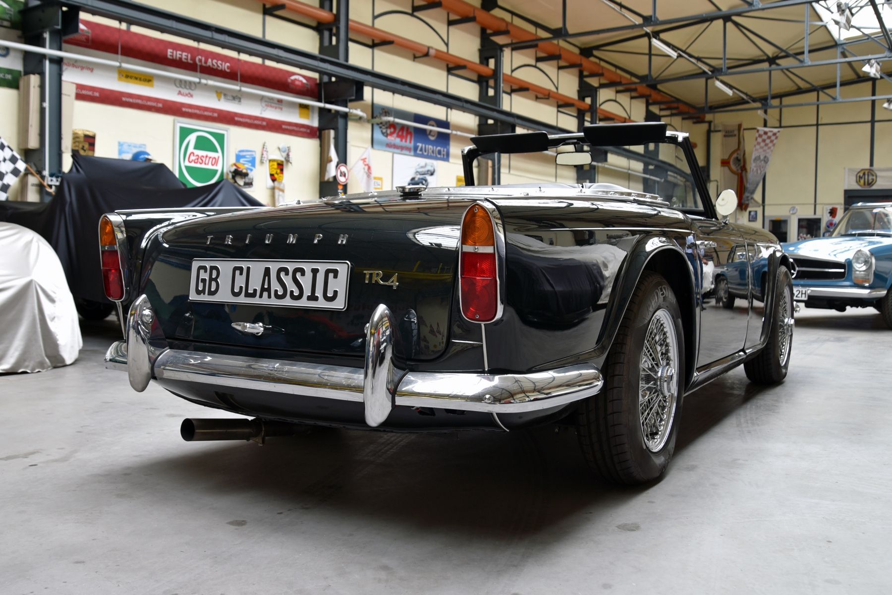 Dieser Triumph TR4 wurde für die USA produziert und in den Staaten am 01.07.1963 zum ersten mal zugelassen. Nach dem Import nach Deutschland, erfolgte eine umfangreiche Restaurierung. Vor einigen Jahren gind der TR4 in neue Hände und der jetzige Besitzer hat den Wagen sehr umfangreich geprüft und perfektioniert. Teilerechnungen von rund € 4.600,00 Euro und über 150 KFZ-Meister-Stunden wurden investiert. Die Farbe ist dunkelgrün und wirkt - man kann dies auf den Fotos gut sehen - je nach Beleuchtung und Blickwinkel schwarz. Der Innenraum ist perfekt. Die Ledersitze haben einen weißen Keder. Das Armaturenbrett ist in Wurzelholz, das sportliche Lenkrad fügt sich in das harmonische Gesamtbild ein. Das Wetterequipment ist komplett und beinhaltet ein Verdeck sowie ein Voll-Tonneau.
