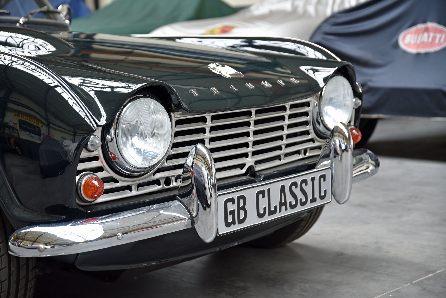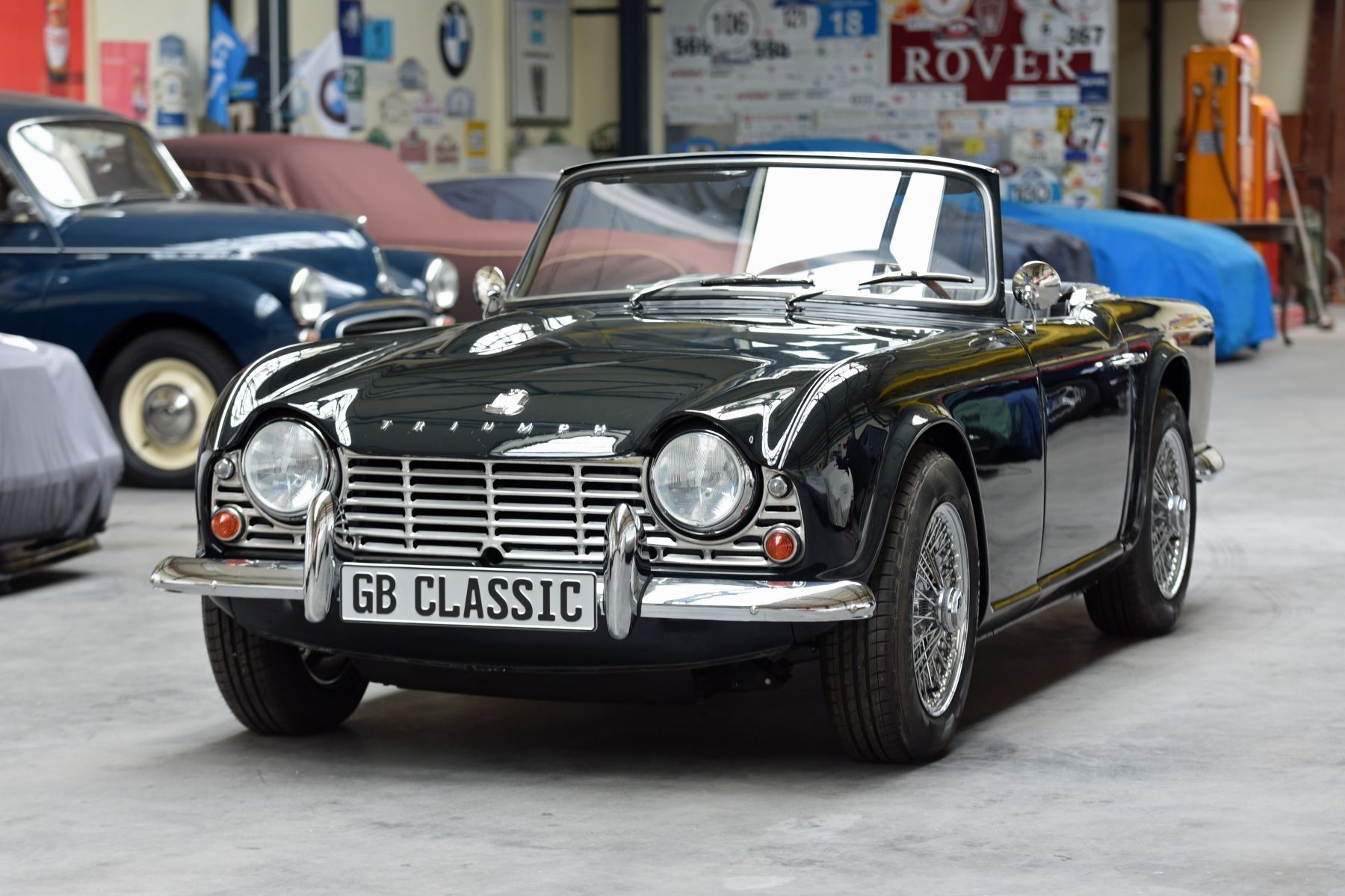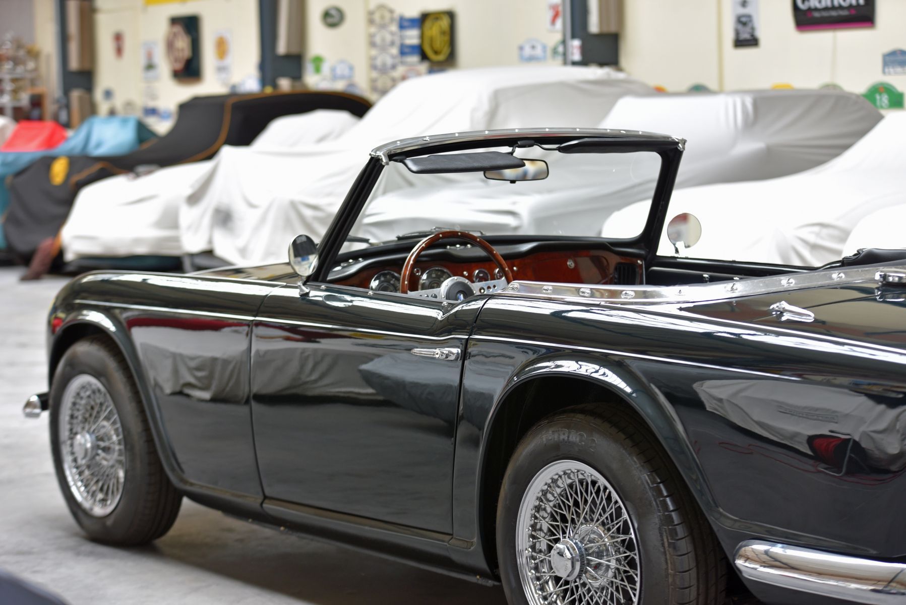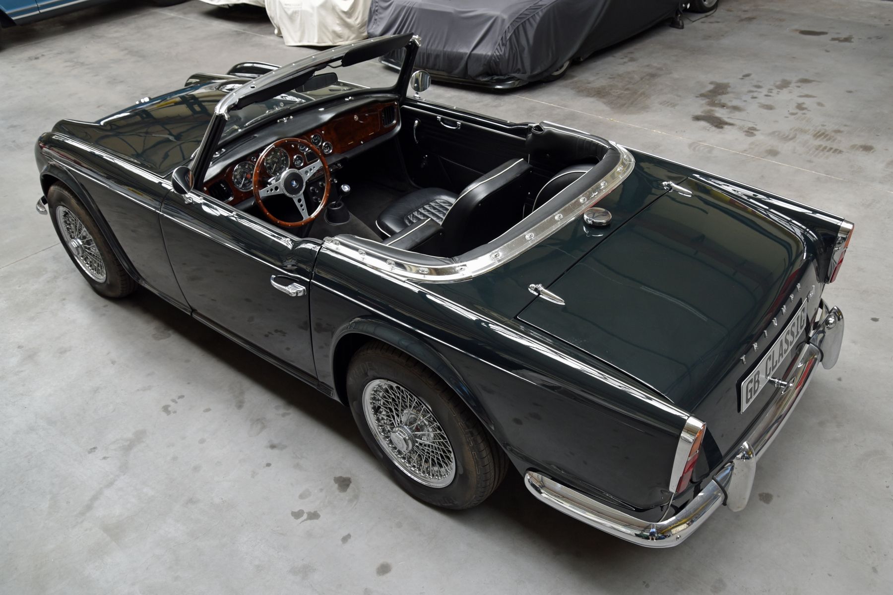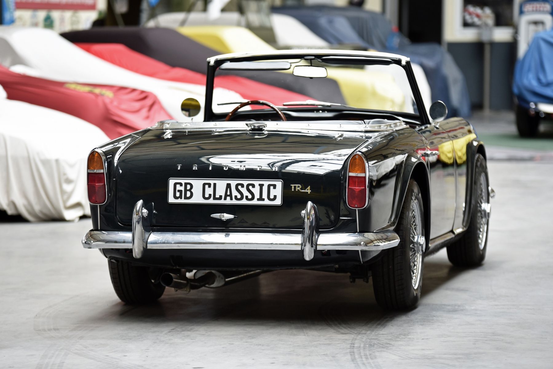 Dieser Triumph TR4 wurde für die USA produziert und in den Staaten am 01.07.1963 zum ersten mal zugelassen. Nach dem Import nach Deutschland, erfolgte eine umfangreiche Restaurierung. Vor einigen Jahren gind der TR4 in neue Hände und der jetzige Besitzer hat den Wagen sehr umfangreich geprüft und perfektioniert. Teilerechnungen von rund € 4.600,00 Euro und über 150 KFZ-Meister-Stunden wurden investiert. Die Farbe ist dunkelgrün und wirkt - man kann dies auf den Fotos gut sehen - je nach Beleuchtung und Blickwinkel schwarz. Der Innenraum ist perfekt. Die Ledersitze haben einen weißen Keder. Das Armaturenbrett ist in Wurzelholz, das sportliche Lenkrad fügt sich in das harmonische Gesamtbild ein. Das Wetterequipment ist komplett und beinhaltet ein Verdeck sowie ein Voll-Tonneau.