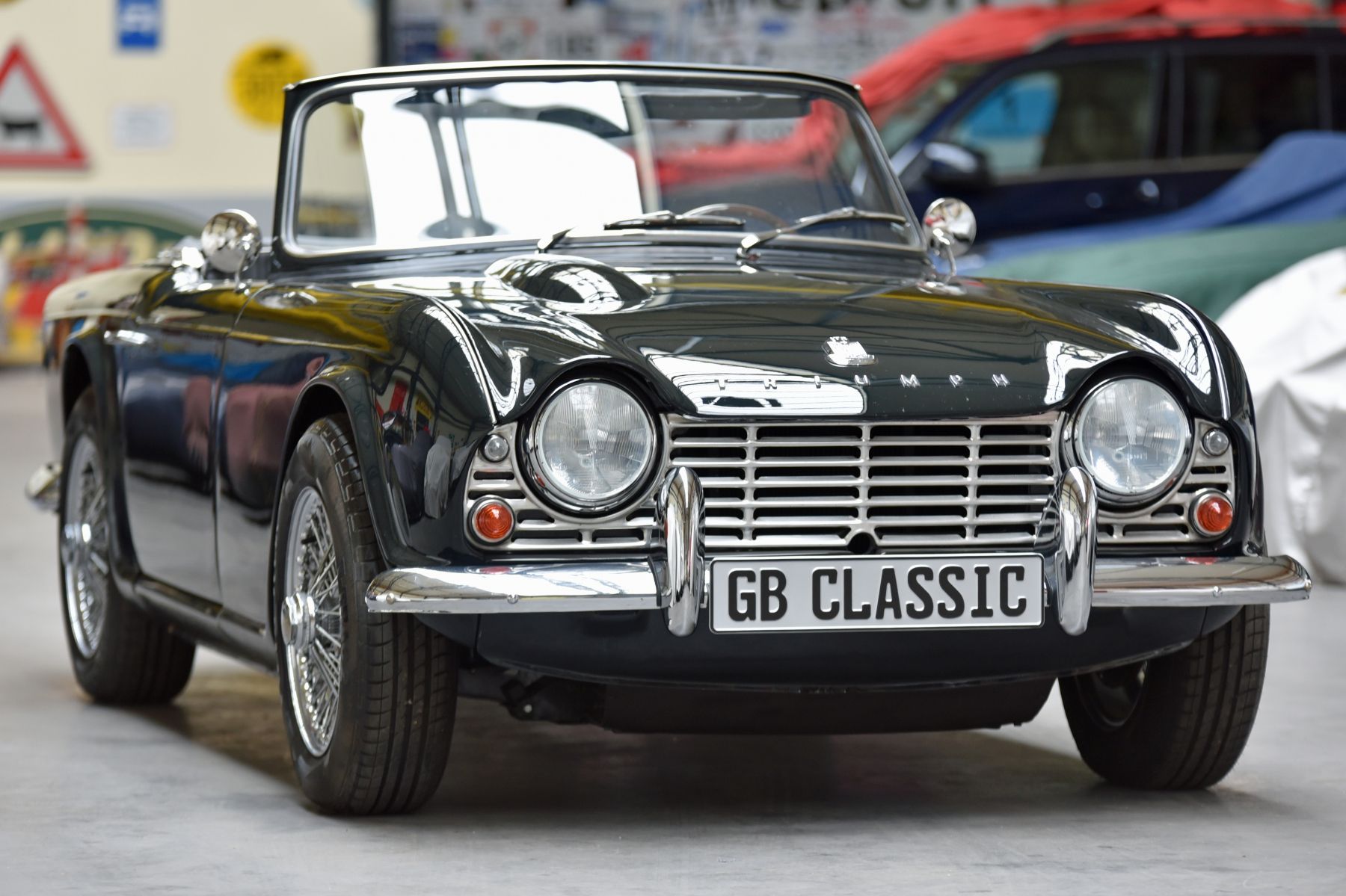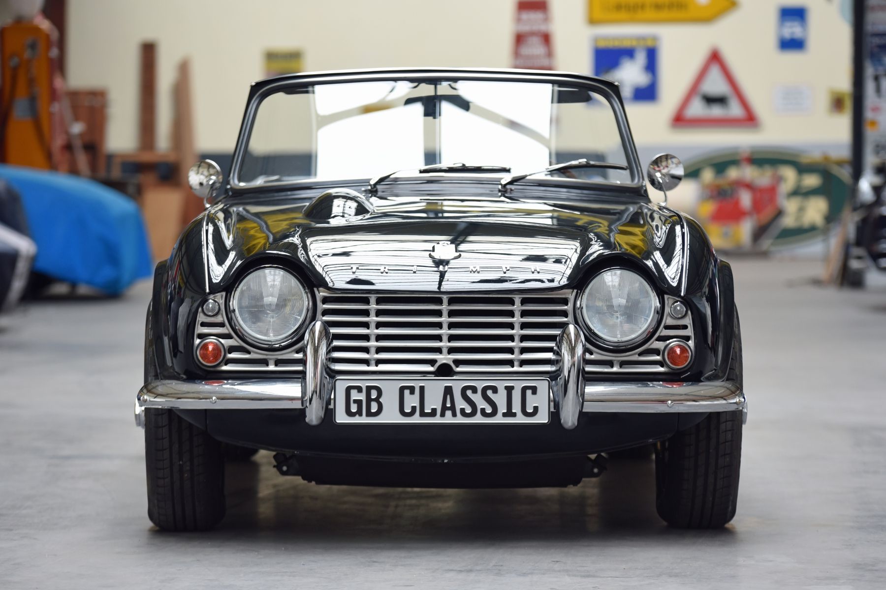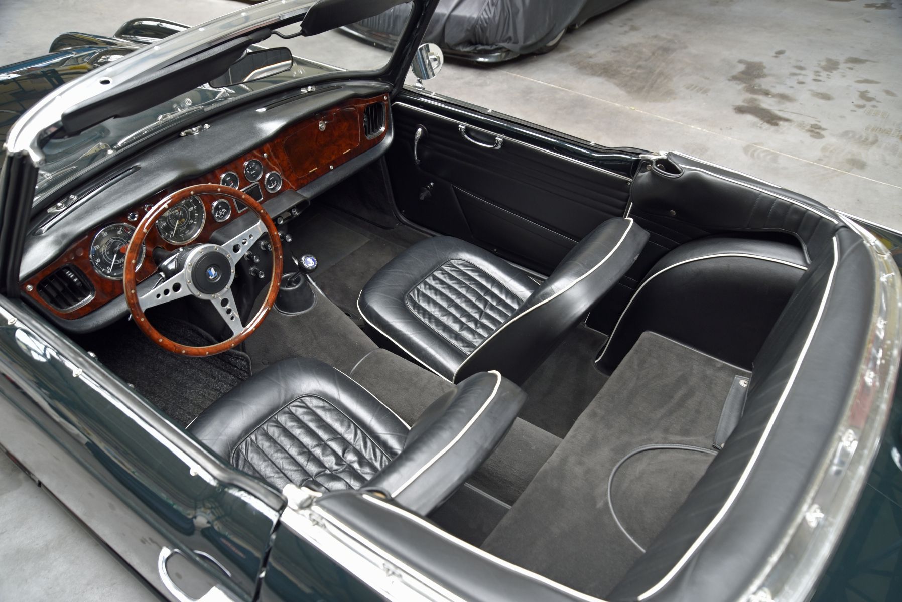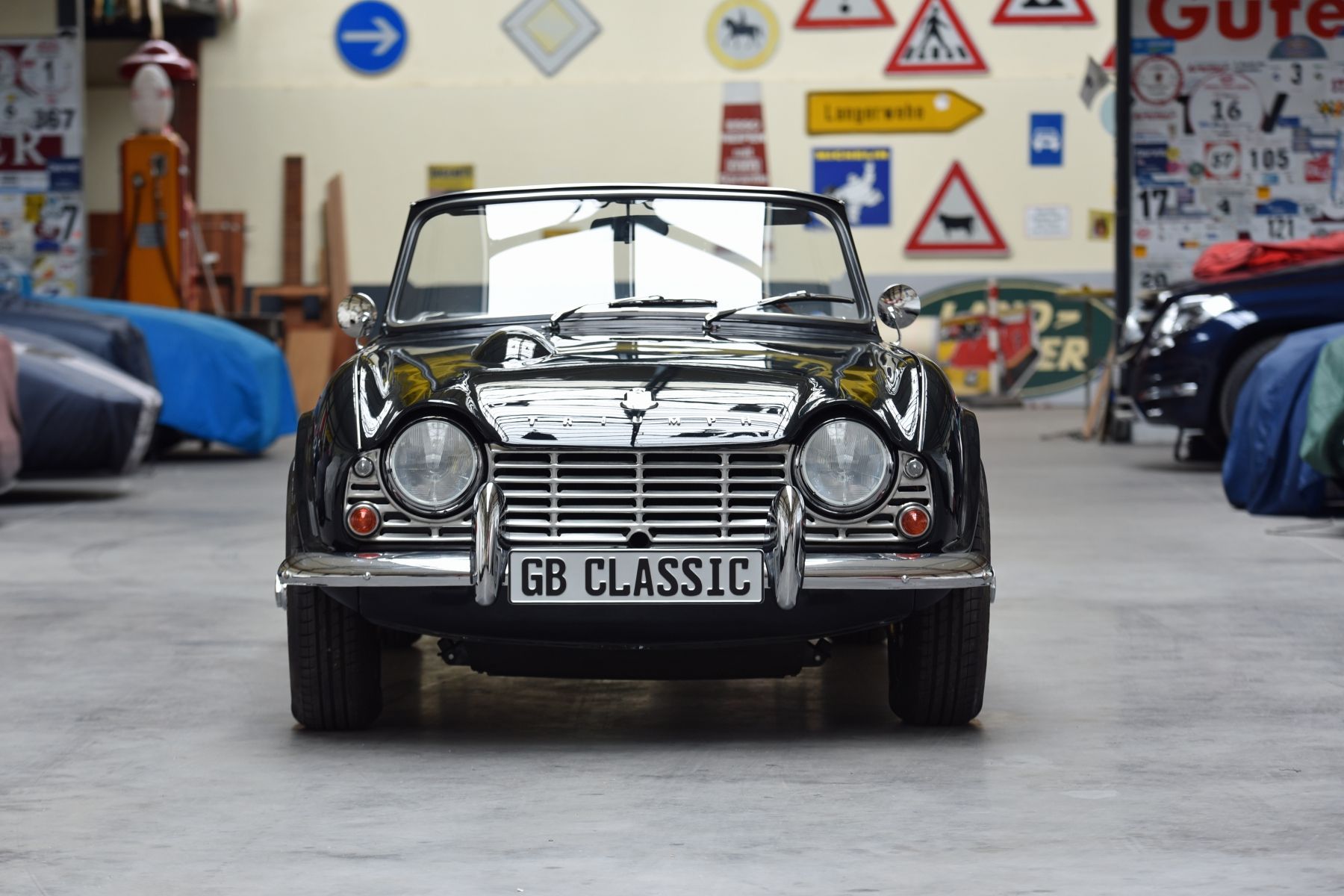 Dieser Triumph TR4 wurde für die USA produziert und in den Staaten am 01.07.1963 zum ersten mal zugelassen. Nach dem Import nach Deutschland, erfolgte eine umfangreiche Restaurierung. Vor einigen Jahren gind der TR4 in neue Hände und der jetzige Besitzer hat den Wagen sehr umfangreich geprüft und perfektioniert. Teilerechnungen von rund € 4.600,00 Euro und über 150 KFZ-Meister-Stunden wurden investiert. Die Farbe ist dunkelgrün und wirkt - man kann dies auf den Fotos gut sehen - je nach Beleuchtung und Blickwinkel schwarz. Der Innenraum ist perfekt. Die Ledersitze haben einen weißen Keder. Das Armaturenbrett ist in Wurzelholz, das sportliche Lenkrad fügt sich in das harmonische Gesamtbild ein. Das Wetterequipment ist komplett und beinhaltet ein Verdeck sowie ein Voll-Tonneau.
