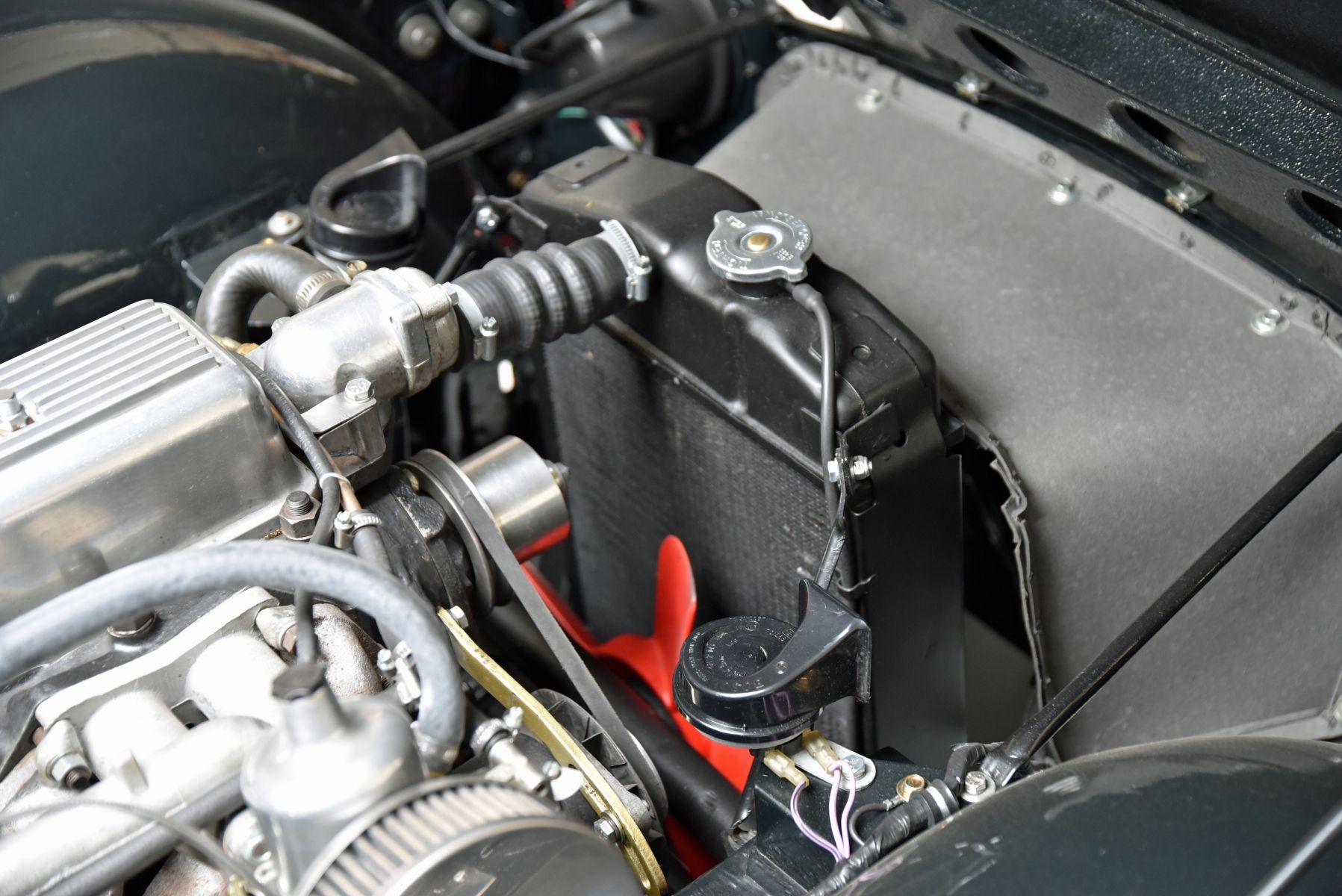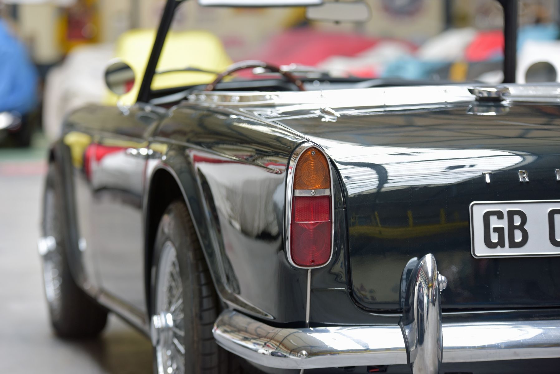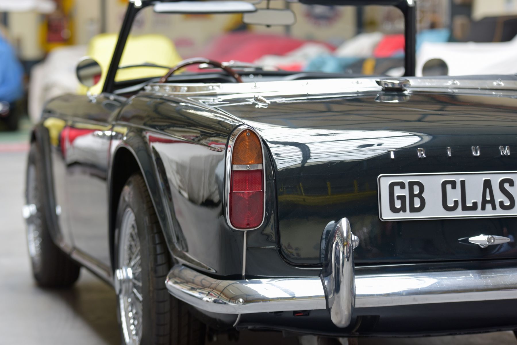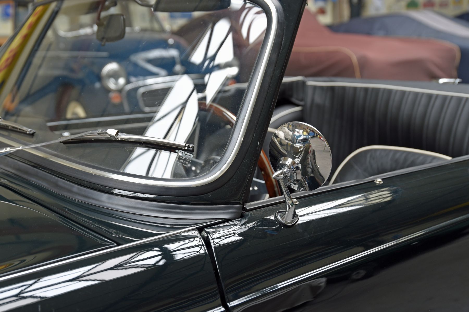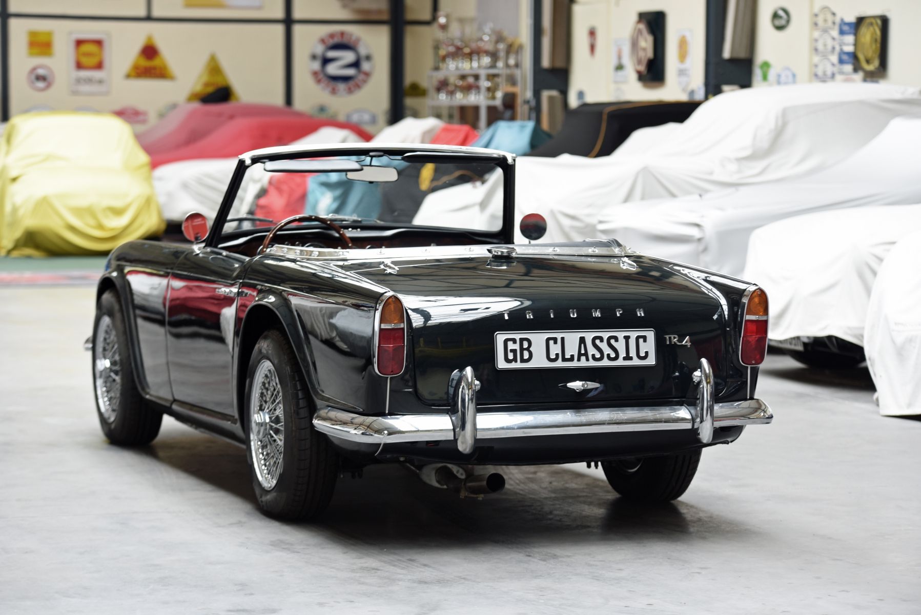 Dieser Triumph TR4 wurde für die USA produziert und in den Staaten am 01.07.1963 zum ersten mal zugelassen. Nach dem Import nach Deutschland, erfolgte eine umfangreiche Restaurierung. Vor einigen Jahren gind der TR4 in neue Hände und der jetzige Besitzer hat den Wagen sehr umfangreich geprüft und perfektioniert. Teilerechnungen von rund € 4.600,00 Euro und über 150 KFZ-Meister-Stunden wurden investiert. Die Farbe ist dunkelgrün und wirkt - man kann dies auf den Fotos gut sehen - je nach Beleuchtung und Blickwinkel schwarz. Der Innenraum ist perfekt. Die Ledersitze haben einen weißen Keder. Das Armaturenbrett ist in Wurzelholz, das sportliche Lenkrad fügt sich in das harmonische Gesamtbild ein. Das Wetterequipment ist komplett und beinhaltet ein Verdeck sowie ein Voll-Tonneau.