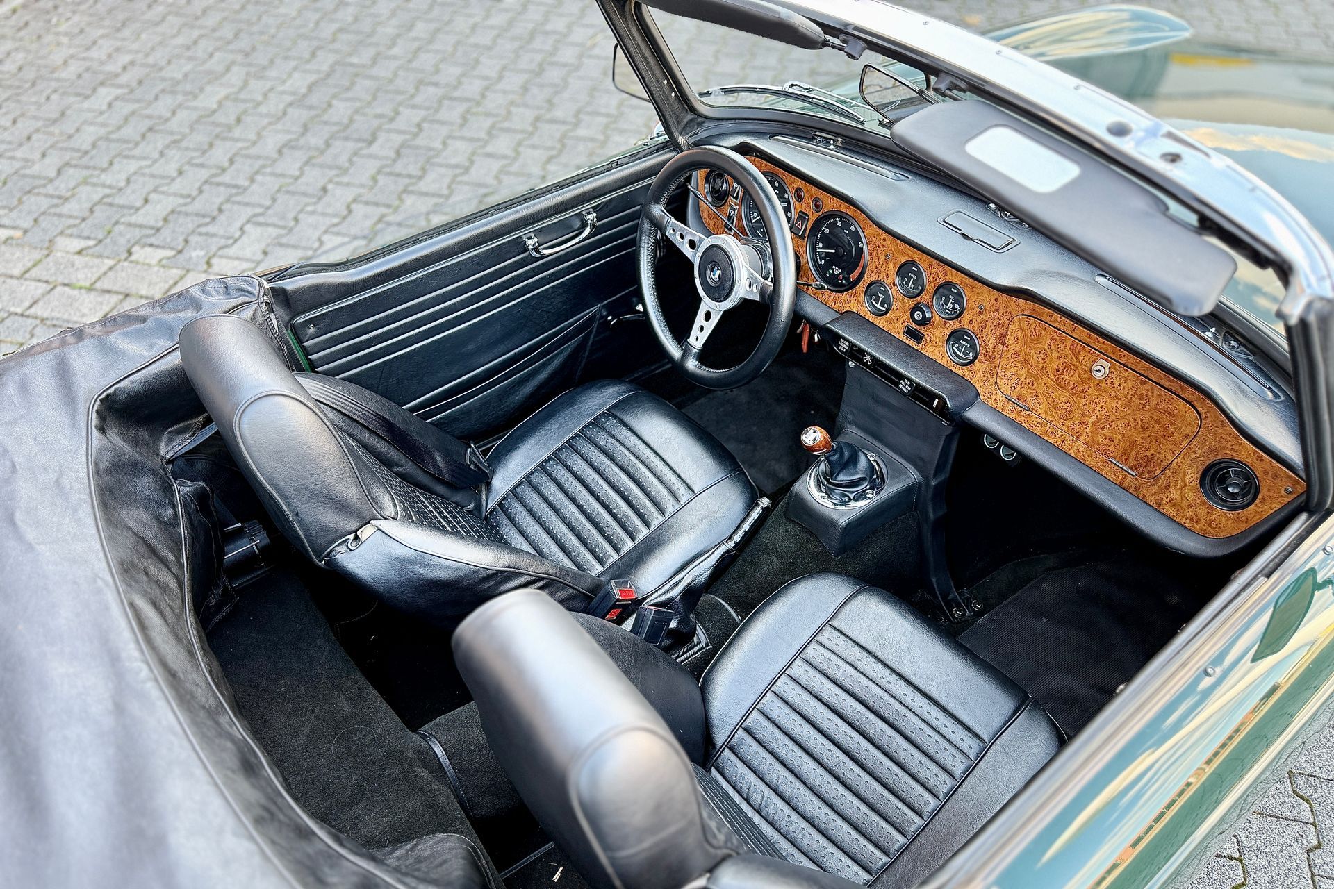 Dieser TR6 war gut 13 Jahre bei einem Eigentümer und wurde in dieser Zeit regelmäßig in einer Fachwerkstatt gewartet. Die eigentliche Restaurierung ist länger her und im Lack finden sich - wenn man genauer hinsieht - ein paar kleinere Gebrauchsspuren, bzw. ein paar nicht ganz perfekte Stellen. Der Wagen hat einen Overdrive, eine Persenning, Chromspeichenräder mit Reifen aus 2025 (Vredestein Sprint Classic) sowie eine Perfomance Abgasanlage aus Edelstahl. Die Stromberg Vergaseranlage hat man vor ein paar Jahren gegen eine neue SU HS6 Anlage ausgewechselt. Unseren Betrieb verlässt der TR6 mit einer frischen Inspektion und einer neuen Haupt- und Abgasuntersuchung.